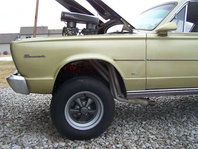 In true gasser fashion, this Barracuda comes with fender well headers and mufflers built into the collectors. According to the listing, the car also comes with new rear leaf springs, a new Vega steering gear and new front disc brakes.