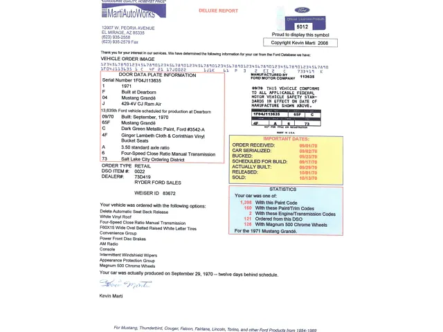 Looking at the Marti Report some more, you can see this Grandé is one of 1,398 painted in Dark Green metallic, of which only 160 were built with Ginger cloth and vinyl interior. Only 121 Grandés were ordered for the Salt Lake City district, and only 128 were ordered with the performance-oriented Magnum 500 wheels. This car also was originally ordered with a white vinyl roof (standard on the Grandé) and other options that were typical for Mustangs back then, such as an AM radio, the Protection Group (bodyside molding and bumper guards), and the Convenience Group (numerous lights and buzzers). But being a Grandé, it already was well-equipped with cloth and vinyl seating plus fancy door trim, map light, rocker molding, pedal trim, and more.
