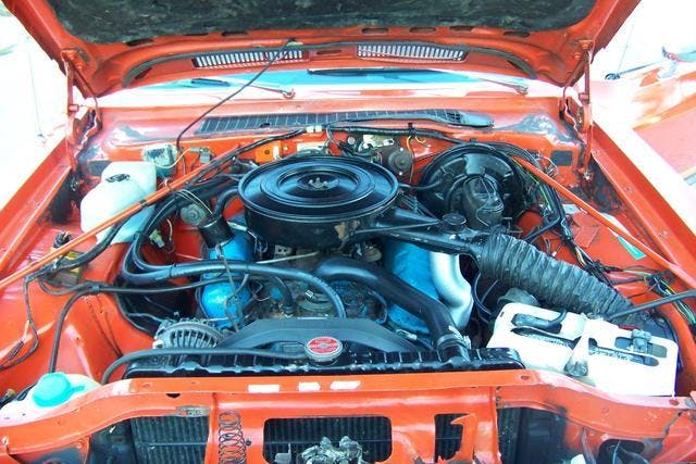 Nope, enthusiasts had to make do with either a 318 (150hp) or a smogger 360 (170hp, equipped with a single exhaust) –both of which were only available with a 2-bbl carburetor for ‘76. The 318 came with either a 4-speed manual or 3-speed auto, while the 360 was restricted to the slushbox.