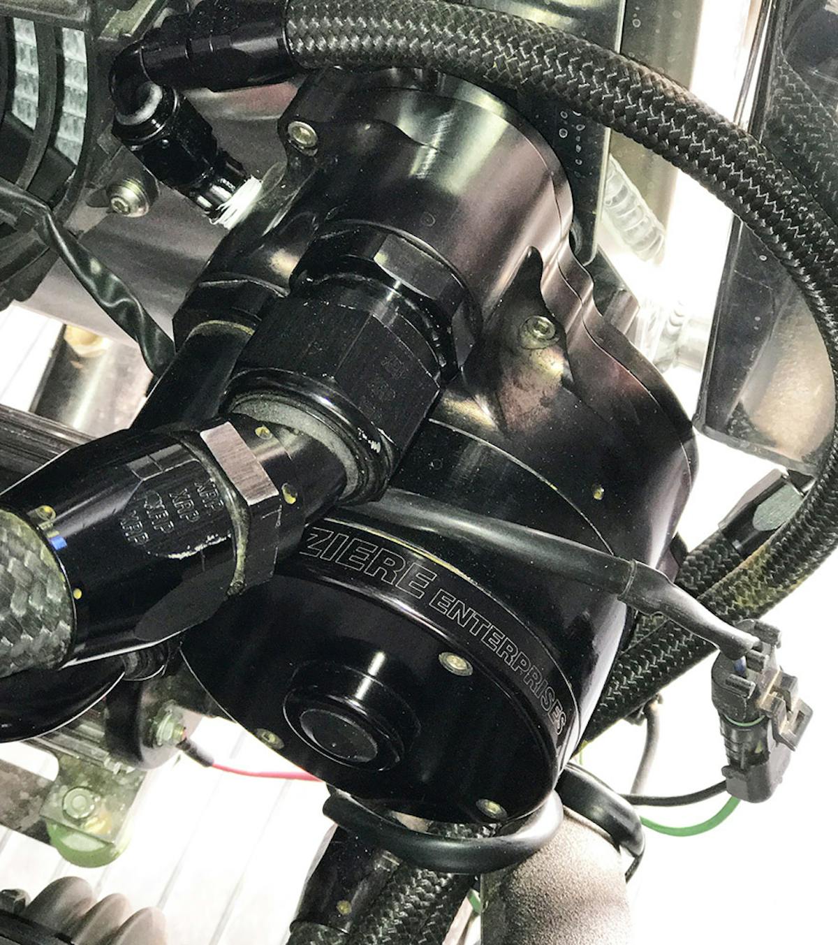 “The downside of a mechanical pump is that it robs a significant amount of horsepower to drive it, and that’s a real shame to give up precious horsepower considering how hard we work to make it,” Meziere says.