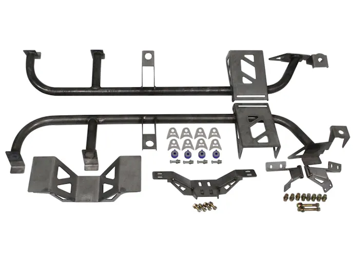 The 1955-1957 Chevy kits feature welded tubular side rails, adjustable transmission crossmembers, factory body mounting locations, and bolt-on motor mount frame stands designed for use with Chevy small block, big block, and LS engines. Unlike many frame braces, the included rear crossmember allows the use of a full x-pipe dual exhaust.