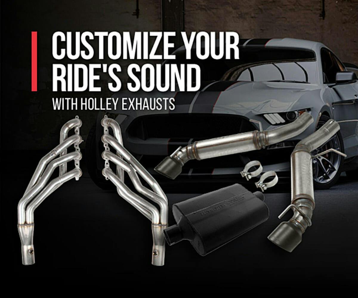 Holley offers multiple exhaust systems for a variety of applications, each with different tones and sound levels. When choosing an exhaust system, keep in mind not only the external sound level but the sound level inside the vehicle as well. You should also note the material that is used in the system’s construction. Aluminized steel is less expensive and a good option for applications that do not see regular use in harsh weather conditions.