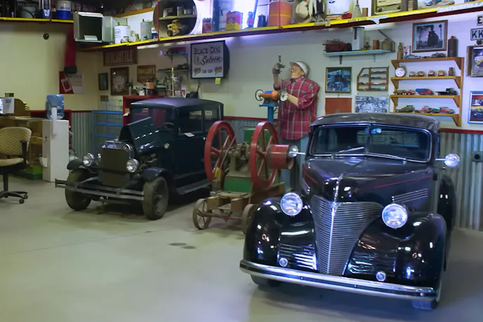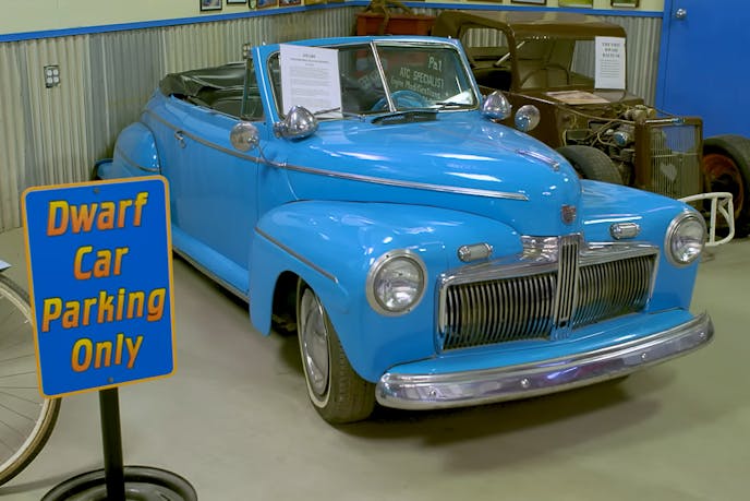 Adams created a museum that features all of the various dwarf cars that he’s built. Inside the museum, you’ll find his first creation, a replica of a 1928 Chevy that was built using nine different refrigerators. The car is powered by a two-cylinder engine, that’s backed by a three-speed transmission that came out of a mail cart. Adams used nearly every part of the refrigerator to make the dwarf car.