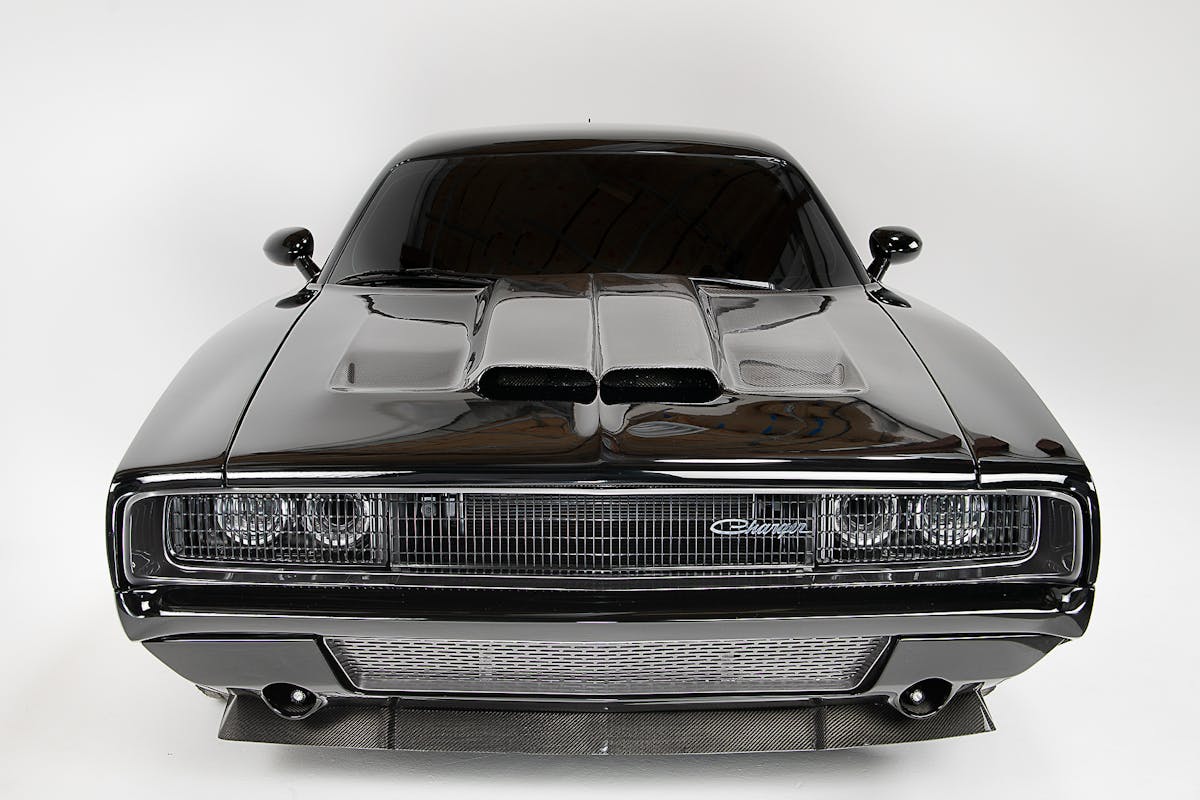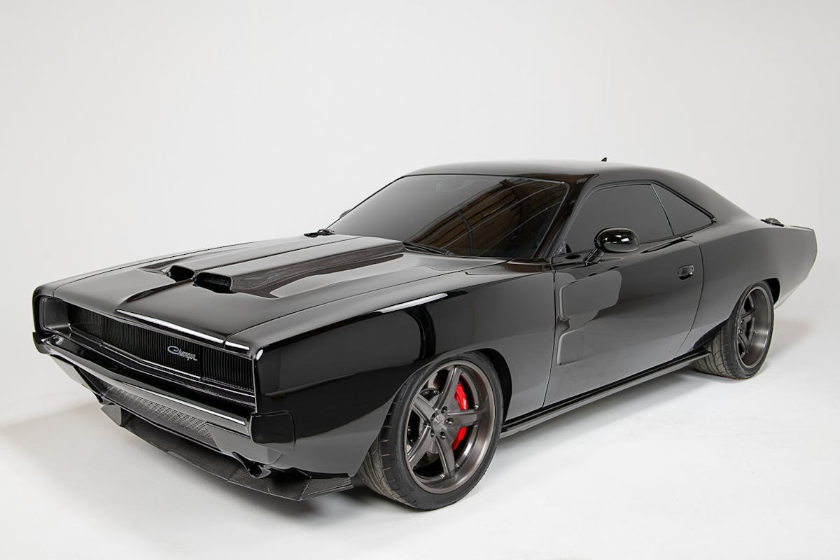 The Black Velvet Charger is painted a special Black Pearl hue with custom stripes, graphite trim, and Black Laguna leather interior. For extra style, the Black Velvet Charger rolls on a set of Forgeline custom brushed translucent Smoke wheels wrapped in Nitto rubber.