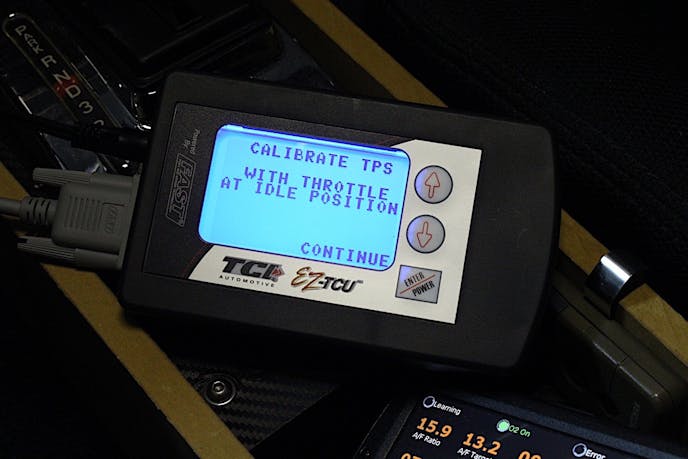 Next is the TPS calibration, which lets the transmission know where the throttle is in relation to engine speed and vehicle speed. This is set at rest (idle) and depressed (WOT). After the TPS is set, the base settings are done, and shutting off the ignition and EZ-TCU will save your tune.