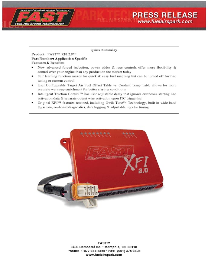 After listening to racer input and appeals for specific features, FAST™ engineers have designed the revolutionary new XFI 2.0™ with a host of improved functions and advanced capabilities. This new version of the popular electronic fuel injection system includes everything from the original XFI™, but adds an expanded user interface that controls an assortment of new options, including power adders, forced induction, progressive controllability and other advanced racing specific strategies and features.