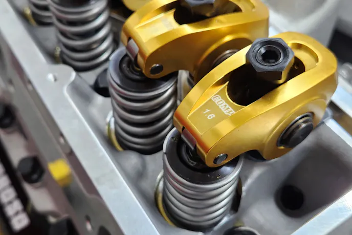 The newly assembled short block was then topped with PM’s 180cc aluminum cylinder heads, with 2.02 and 1.600 stainless valves, bronze valve guides, and Comp Cams dual valve springs to match the hydraulic roller cam. The cam measures 240 degrees of duration on the intake and 252 degrees on the exhaust at 0.050 on a 108 degree lobe separation angle. Comp Cams 1.6 ratio full roller Ultra-Gold Aluminum Rocker Arms pushed the valve lift to 0.608 inches on the intake and 0.592 inches on the exhaust. This combination brings our crate engine to a pump-gas-friendly 10.4:1 compression ratio that can breathe easily to make 500-plus horsepower with an idle that’ll turn heads at the local car show.