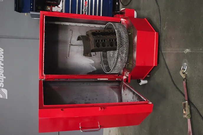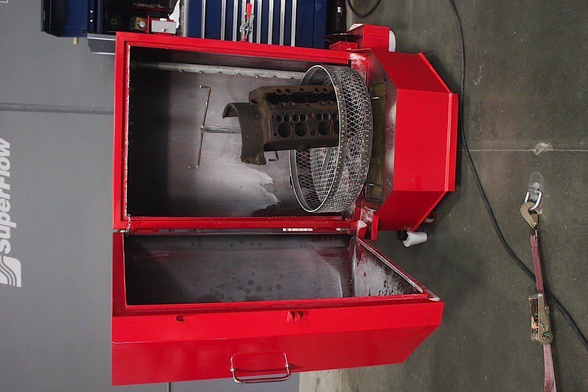 Using the RS-500 couldn’t be simpler. Once it was all set up and plugged in, the engine block went in, the door was shut, and the 60-minute timer was turned on. Hot water-soluble detergent shot out of nozzles surrounding the rotating assembly, and all the excess grit and grime collected in a tray that was separated by the steel skimmer, which fed into a reservoir (we used a bucket).