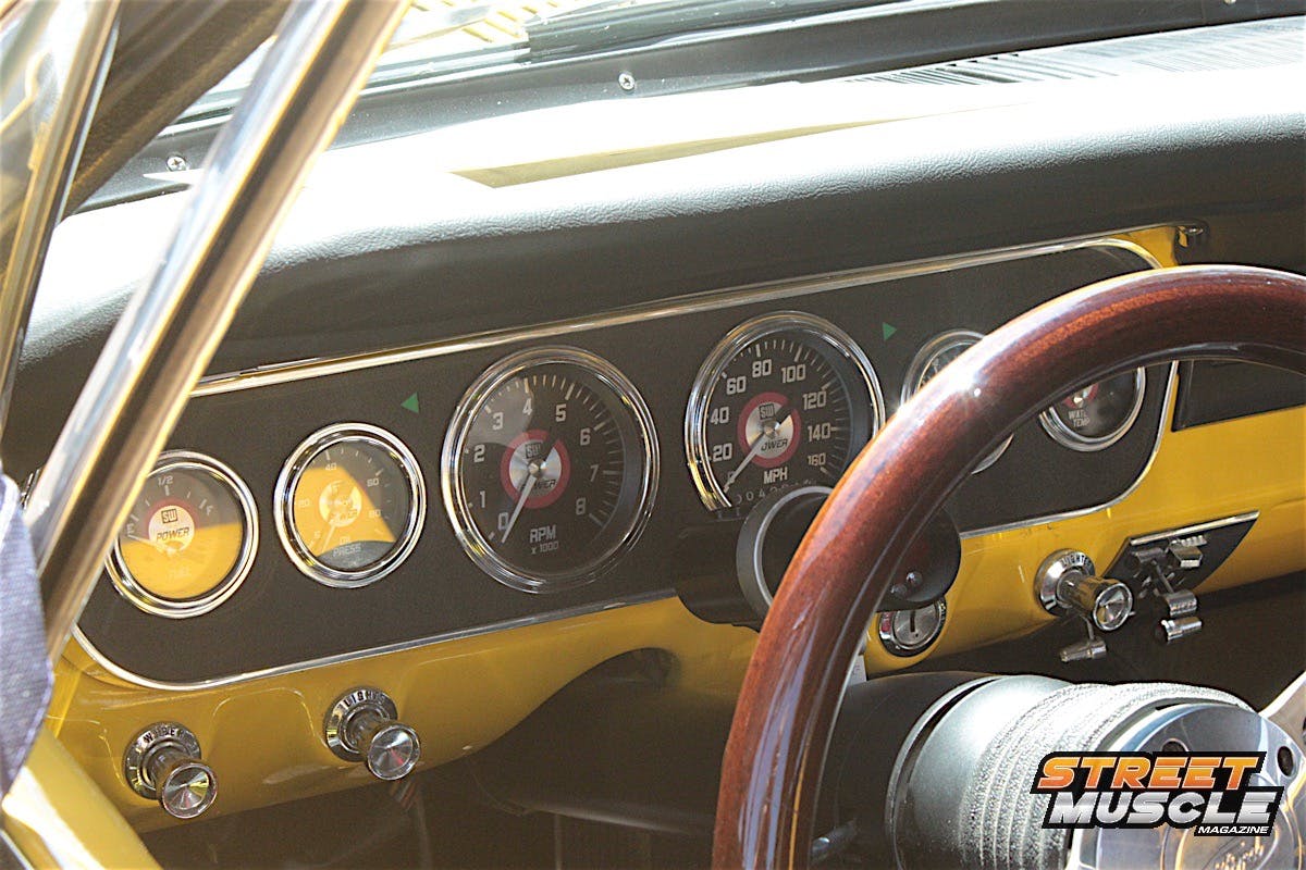 The spartan dash is highlighted by a custom billet steering wheel and a period-style radio with not much else to look at, save for the sliding controls for the ventilation. We’d say when it comes to cookie-cutter Novas, Pete colored outside the lines a little with this one.