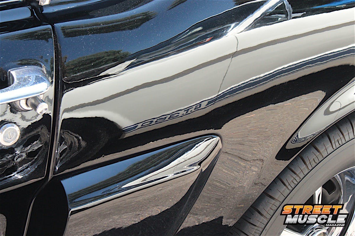 Slowing the beast is a set of Wilwood multi-piston calipers, with 18-inch wheels wrapped in 245/45 and 285/40 rubber front and rear. Even with the hood closed, you couldn’t miss the multiple cues as to what powers this B-body. SRT-10 emblems are used on the fenders and rear of the car, and even under the hood.