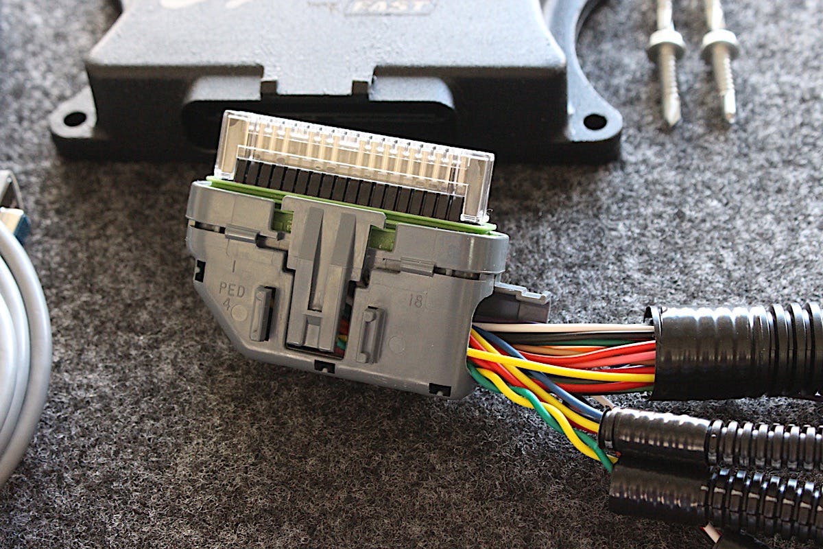 TCI Auto’s Will Vance did give us some connection basics, as seen in the video above. Because the EZ-TCU works electronically, it requires input for speed, RPM, and throttle position in order to function properly. For those with a carburetor, TCI Auto offers a remote TPS that the harness can plug into. Because we already have a FAST EZ-EFI, we are able to utilize the FAST TPS wire for our signal. The new EZ-TCU harness provides a single hook up wire (white with a red tracer) for that connection.
