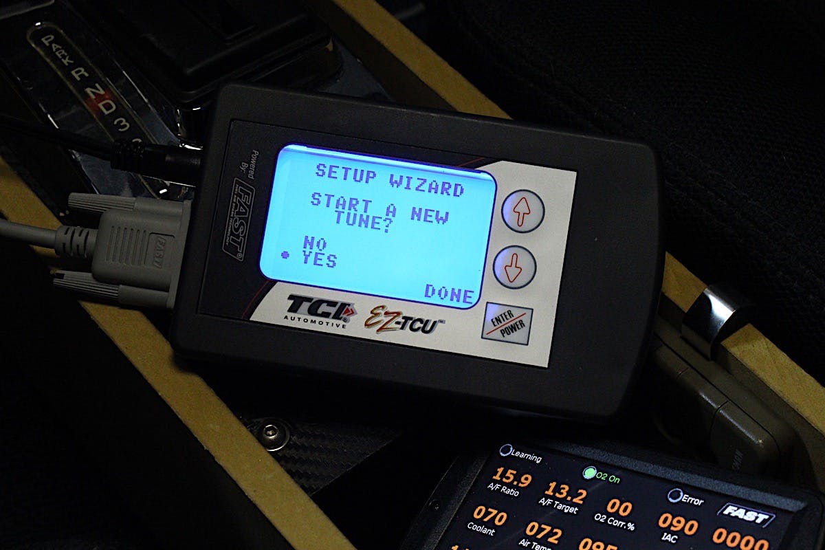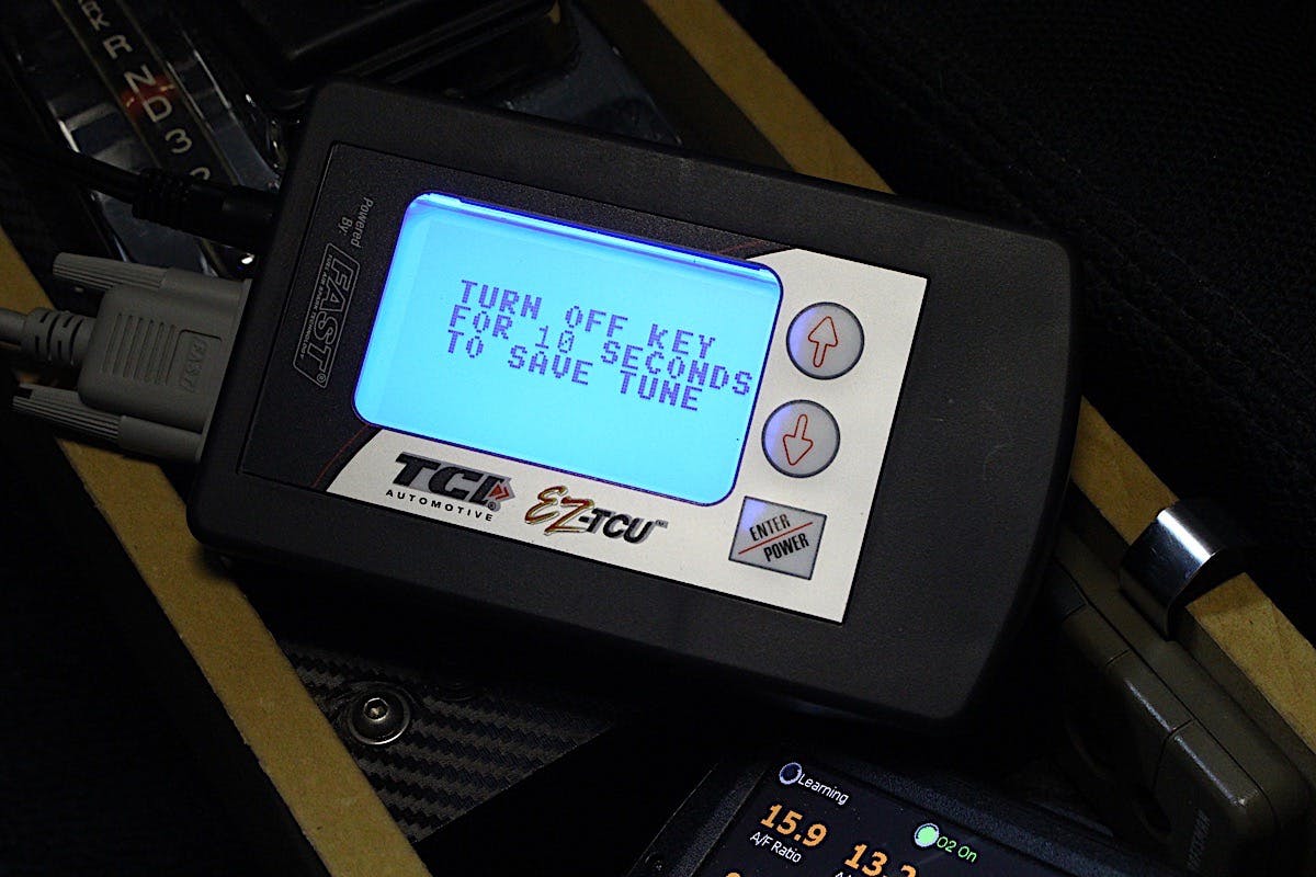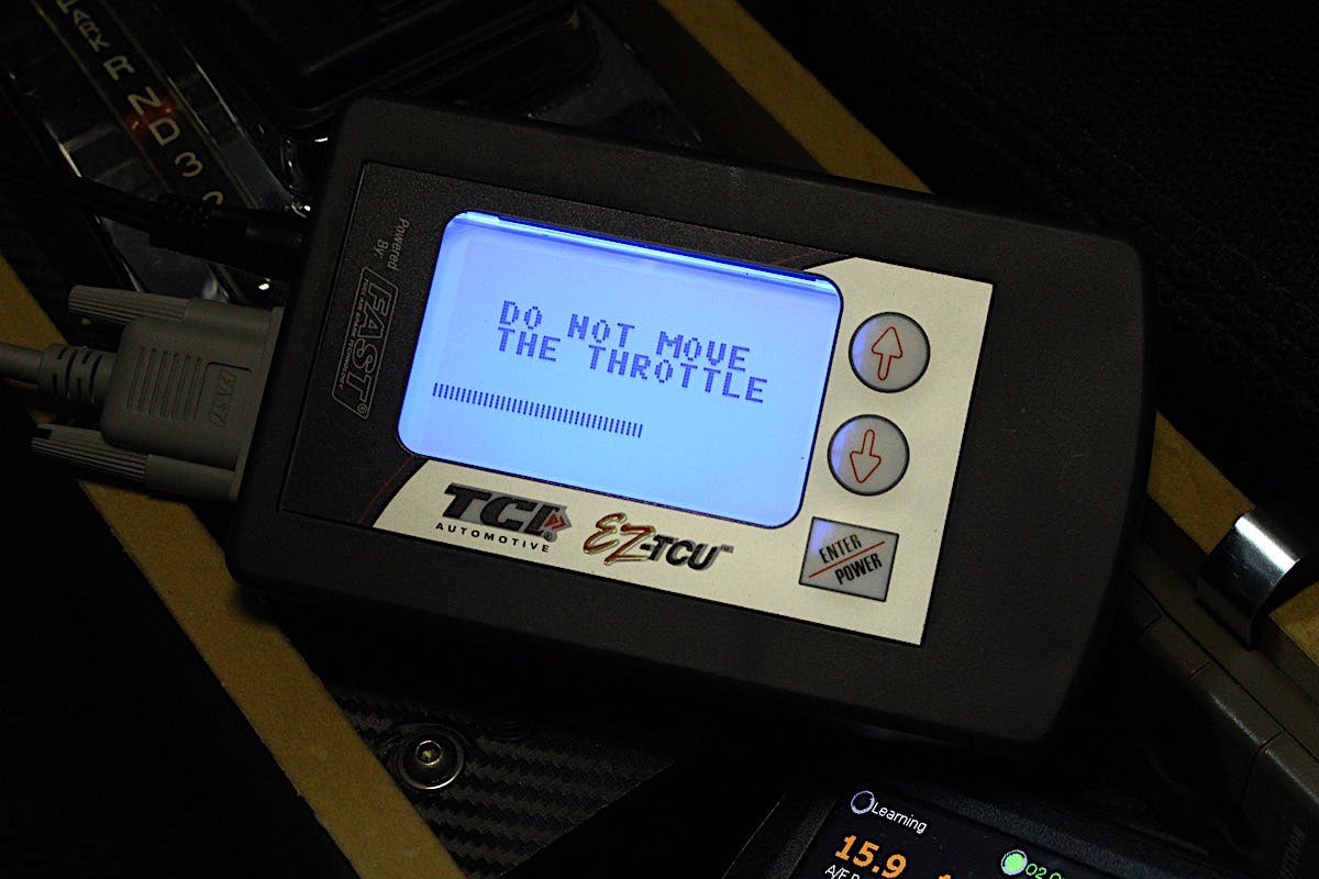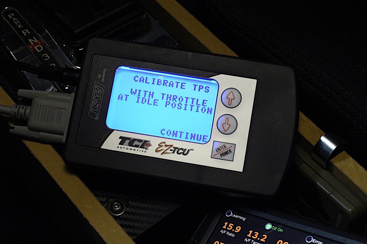 “My TCU is a little finicky about the TPS reading,” Vance said. “You should only need the white/ red wire from my harness connected to the 0-5V reference wire on the TPS of the FAST system.” Although ours was a bit shy of the recommended .5 volts at idle it was a simple fix, and Vance suggested making an adjustment on the FAST TPS to attain a minimum of .5 volts. (Note: If making this adjustment to the TPS, don’t forget to re-calibrate the TPS on both the EFI system and the EZ-TCU through the settings.)