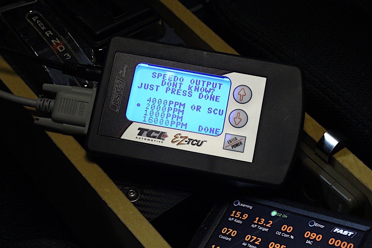 My TCU is a little finicky about the TPS reading. You should only need the white/red stripe wire from my harness connected to the 0-5V reference wire on the TPS of the FAST system. -Will Vance, TCI AutoThe remaining connections are straightforward and simple: the pink wire connected to an ignition source, and power and ground connected directly to the battery. Two more connections are based on what you’ve got in the car: speedometer and tachometer. Since we have an aftermarket ignition system and Dakota Digital VHX gauges, we were able to connect these extra wires directly to the control box for our gauges.