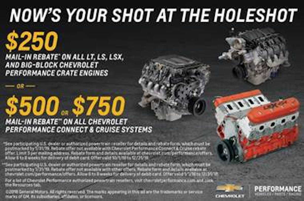 Between October 1, 2018, and December 31, 2018, Chevrolet Performance is holding its new Holeshot rebate program. If you’re looking for a new engine, this will give anyone that purchases any LT, LS, LSX, and big-block performance crate engine a $250.00 mail-in rebate. Talk about performance options!