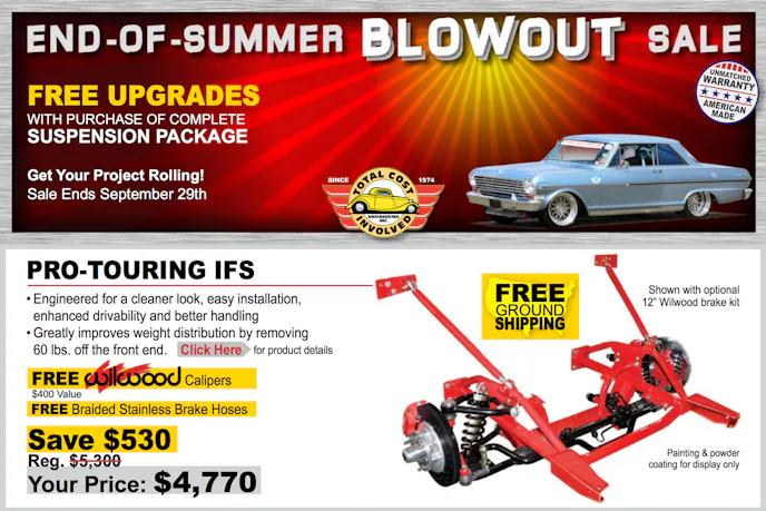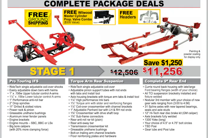 Some notable examples are free Wilwood calipers with a purchase of a Pro-Touring Independent Front Suspension kit, a free rear anti-sway bar with the purchase of front and rear four links, and a free Wilwood Master Cylinder and free headers with complete chassis packages – for those of you with the big bucks.