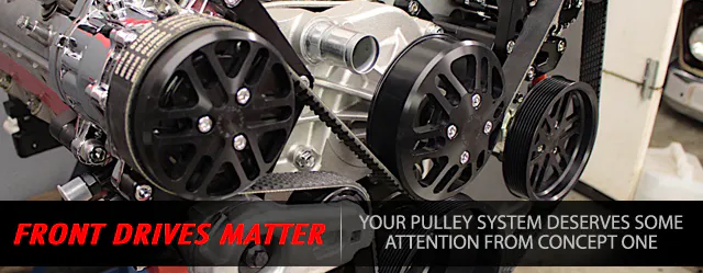 “For motors making a lot of horsepower, belt slippage and flex on the accessories becomes a bigger concern,” says Kevin Redd of Concept One. “When you’re working with a lot of torque you increase the chances for slippage and these wider, larger diameter pulleys provide more wrap, reducing that potential for slippage.”
