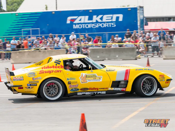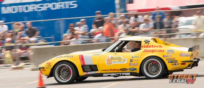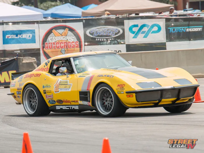 Now, this car looks fast sitting still and it backs the look up when Goldman mashed the loud pedal on the Goodguys Autocross. Roaring through the three-inch custom exhaust the corvette laid down a respectable low 41 second lap time on the course with Talbert putting on a show for the crowd earing the loudest cheers of the weekend.