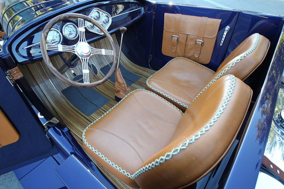 Other defining features of the truck are custom arced fender openings that match the arc of the Daytona wire wheels, which are wrapped in Excelsior shoes, and a Garrett Leather interior with Sid Chavers baseball stitching, one-off Zebrawood banjo steering wheel and floor, and Redline Gauge Works instrumentation.