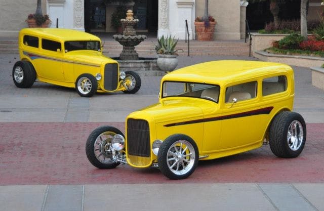 Nearly identical to Gary Meadors' '32 tudor, the 2013-2014 giveaway car (front) is one hot prize vehicle.