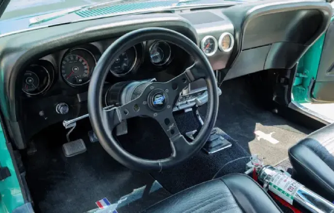 Additional performance enhancements include an MSD digital 6AL ignition control, Blaster 2 ignition coil, Pro Billet distributor, Powermaster alternator, electric fuel pump, and Hooker exhaust headers. The car also features a hydraulic clutch and an aluminum flywheel, ensuring smooth and responsive performance.