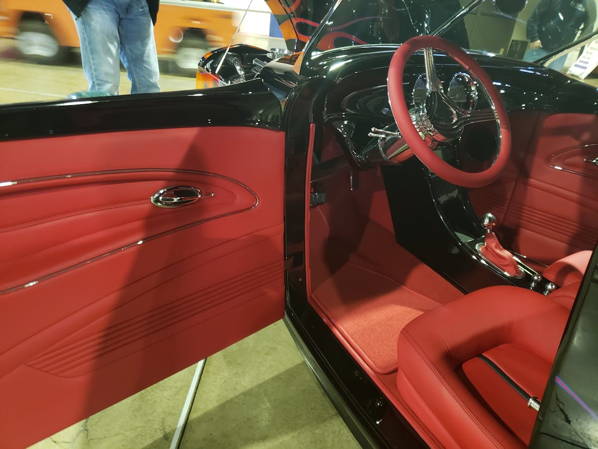 This is the fourth Kugel Muroc roadster and it looked badass under the lights in building 4. Running an LS1 with Hillborn stacks, its curvy body was updated, restored, and flamed by Squeeg’s Kustoms out of Chandler, Arizona. Dig the cherry red interior by Gabes and Dakota Digital gauges.