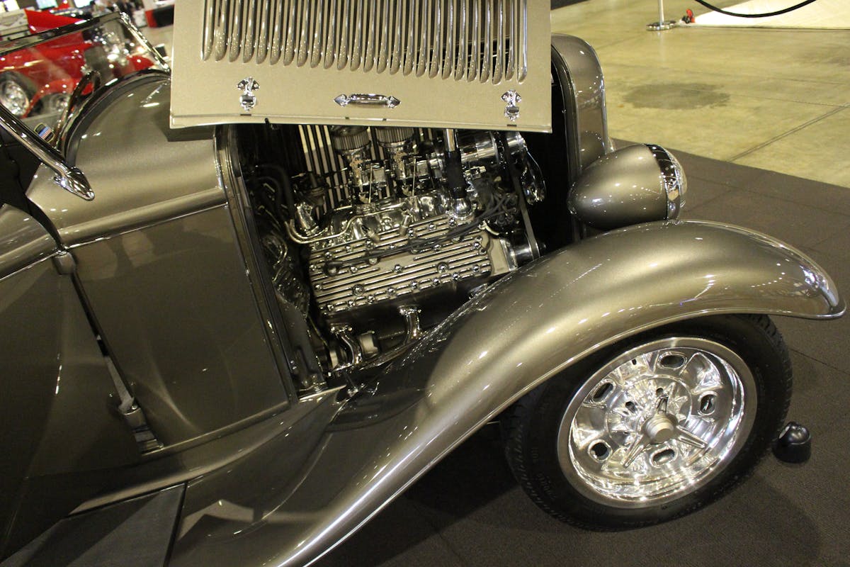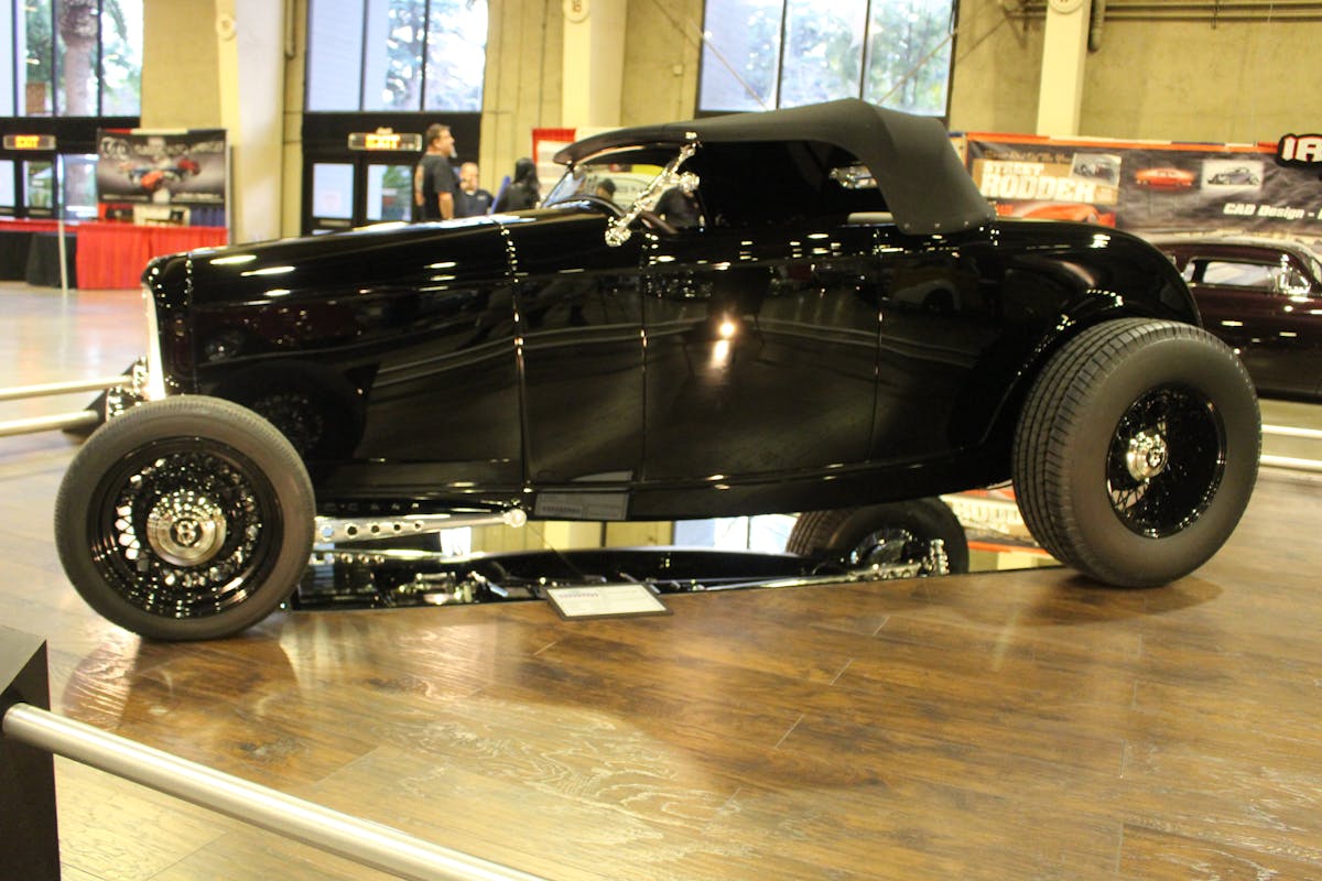 Stoker’s Hot Rod Factory built this ’32, and if there were ever an embodiment of the adage “God lives in the details,” here you go. Flathead powered with nary a flame or scoop in sight, just pure unadulterated sculpture. Interior features an Olds clock steering wheel, cool Cadillac heater, and Classic Instruments gauges. Believe it or not, the color is an off-the-shelf, late-model GM.