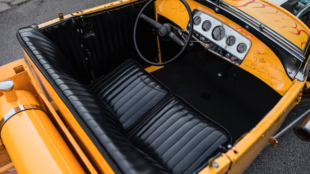 The bright yellow paint, red flames and accoutrements all remind us not to take life so seriously. Powered by a flathead V-8 with short headers and a host of modifications, the truck is the absolute epitome of a vintage hot rod. A very special detail to point out is the dashboard is autographed by members of the cast and crew of the popular show.