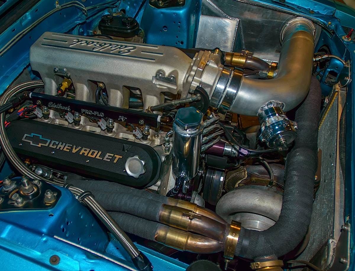 Snarling from under the hood these days is a 409 cubic inch LS engine, based on a RHS block. The block is topped with a set of Trick Flow heads, and an Edelbrock intake manifold. Stuffing boost down it’s throat is a 106mm turbo from Precision. Fuel supply to the fire hose sized injectors comes from a Magma fuel pump, which supplies the engine with a steady diet of E85 from the local pump.