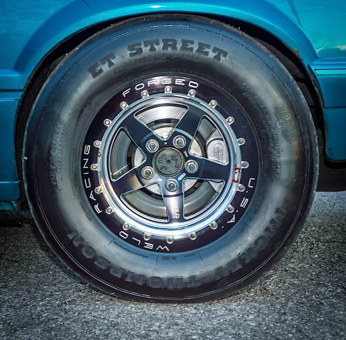 Power is sent to the tires via a PTC powerglide transmission, and nine inch rear differential. The car weights in at 3280 lbs. Peck runs the Mickey Thompson ET Street 275x60x15 rear tires on Weld Racing Race Star rims.