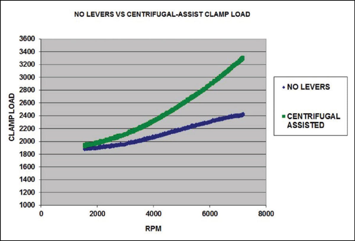 McCombs and the Hays engineers created an organic/ceramic puck material that offers both a high coefficient of friction, yet engages smoothly and requires no break-in period. But the real secret to the Dragon Claw is the centrifugal levers added to the pressure plate that increase the clamp-load at higher engine speeds. Essentially, when engine rpm doubles from 3,000 to 6,000, the Dragon Claw levers add roughly 1,000 pounds of clamp-load to ensure the discs don’t slip, as seen on the accompanying graph.