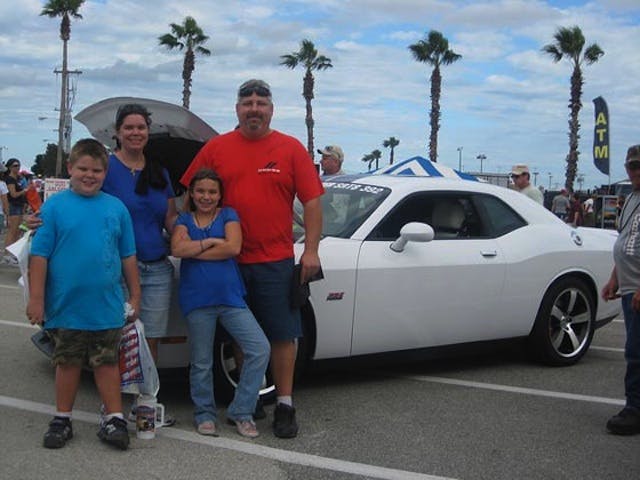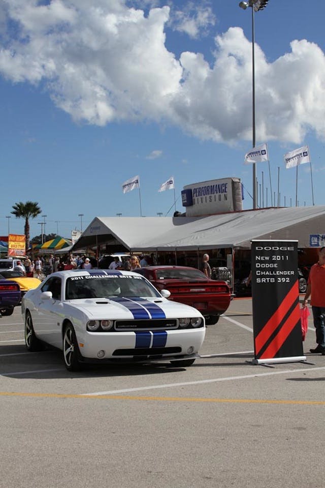As we reported to you previously, Dodge took a driving tour cross country to promote the new 2011 Charger R/T and Challenger SRT8 392. The trip, called the HEMI Highway Tour, kicked off back in November with the plan to cover 30 different cities in 40 days. Planned stops included a number of places of historical significance to the Mopar fans, but their stop at the hallowed ground of the Daytona Speedway was entirely influenced by John and Cheryl Buffington, owners of one of the 6400 2008 Dodge Challenger SRT8’s.