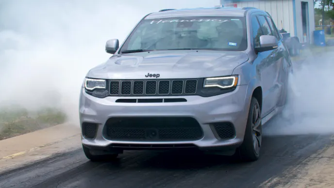 To accomplish the quick run, the Trackhawk received an HPE1200 engine upgrade which takes the factory supercharged 6.2-liter Hellcat V8 and gives it upgraded pistons, rods, ported cylinder heads, camshaft upgrade, long tube stainless steel headers, and a 4.5-liter supercharger system.