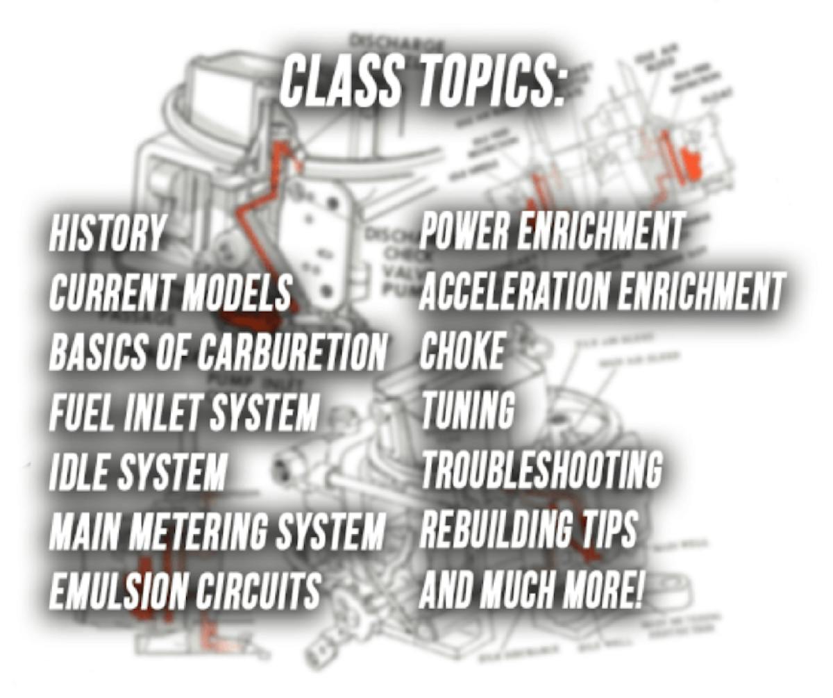 Taking this course will give attendees a fundamental understanding of the various circuits and their functions, as well as initial setup, tuning and proper rebuilding procedures. New for 2020, this course is intended to debunk general misconceptions about carbureted fuel systems as well as give students a first-hand experience for tearing down, inspecting, and re-assembling a model 4150 or model 4160 carburetor.