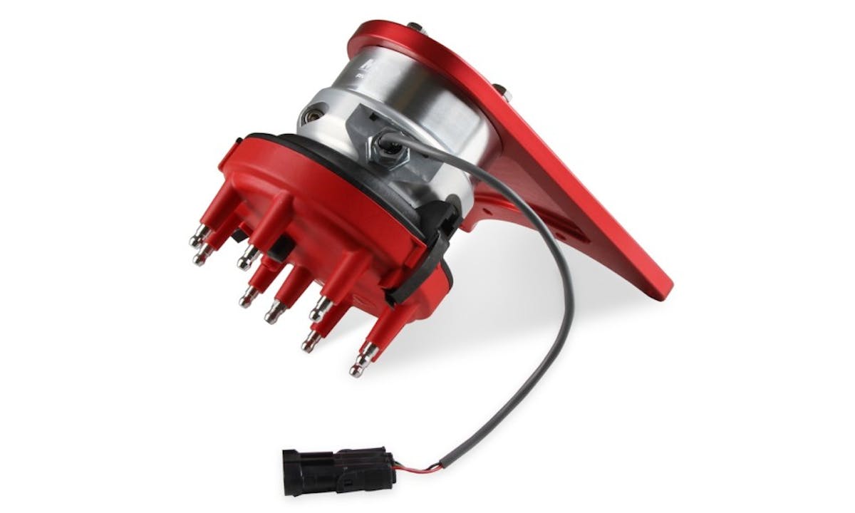 Holley is pleased to announce the release of MSD Pro-Billet Front Drive Distributors. Developed for both big block and small block Chevys, they’re perfect for race engines that need a cam-sync signal for EFI systems but don’t have room for a standard distributor because of inadequate firewall clearance or bulky intake setups. MSD Pro-Billet Front Drive Distributors feature an adjustable Hall Effect sync pickup with a built-in LED for easy adjustments, an extra-wide 9mm belt driven by a pulley on the camshaft, and a band-clamp mount for fast, easy rotor-phasing. They come complete with a billet-aluminum bracket and lower housing, a billet distributor head, and a new gear for the camshaft.