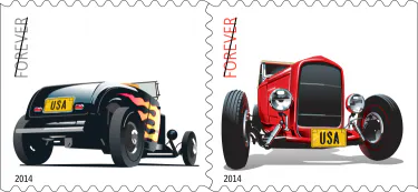According to a release from the USPS the stamps were, “Designed by Derry Noyes of Washington, DC. The two stamps were digitally created by artist John Mattos of San Francisco. Each stamp features an iconic 1932 Ford Deuce roadster and honor America’s pastime of customizing cars, which became very popular in the 1950s when hot rodding reached its peak.”