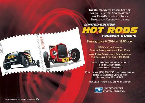 If you’re an avid stamp collector as well as a hot rod enthusiast, then this coming June will bring some joy to your heart. On June 6th 10:30 a.m. EDT Postmaster General, Pennsylvania native, and fellow car enthusiast, Patrick Donahoe, will be leading the First-Day-of-Issue ceremony for a limited edition run of Hot Rods Forever stamps. The ceremony will be held at the NSRA Street Rod Nationals East Plus event.