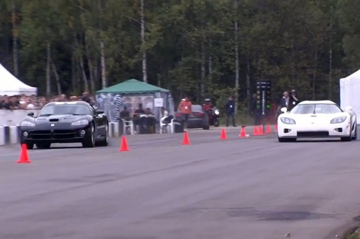 The mid-engine, custom-built Koenigsegg CCXR is one of the fastest production cars in the world, powered by a 4.7 liter twin-supercharged V8 engine that will make about 1,098 horsepower on E100 ethanol. With an estimated top speed of 271 mph and a price tag of around $2 million, it is truly a rare breed of automobile. But a simple supercharger upgrade on the Dodge Viper SRT10 pumps it up to 750 horsepower, and as the video shows, the Viper gets a good jump on the CCXR.