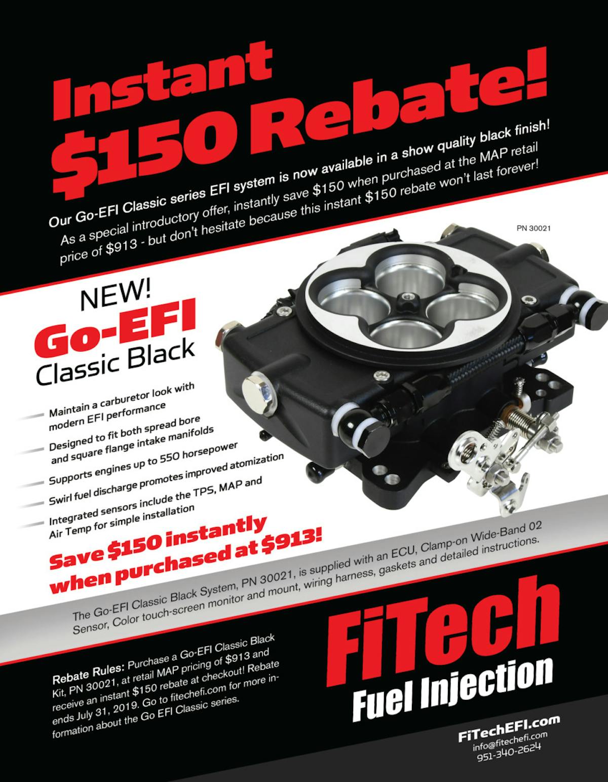 Time to bring your ride into the 21st century?  Well good news, the leader in EFI system, FiTech, is sweetening a deal with an instant $150.00 rebate on their Go-EFI Classic Black system.