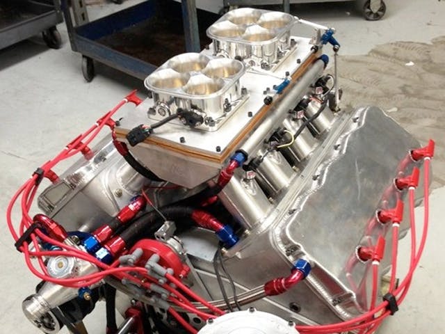 Moroso handles the oiling from pan to dry sump; there’s also a sheetmetal intake manifold on top fed by a set of Accufab billet throttle bodies and Waterman mechanical fuel pump.
