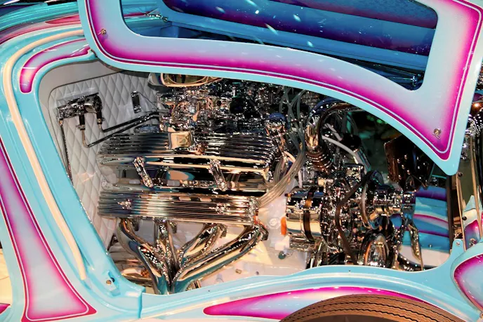 Paint was a product of the amazing talent of Daryl Hollenbeck from Vintage Color Studio. The masterfully applied work seems to instantly transport onlookers back in time to when things were a bit more colorful and imagination was the limit. The design incorporates styles popular to the period, colors that are impossible to ignore and that “hard-candy” finish prevalent to the cars of the 60’s custom era.