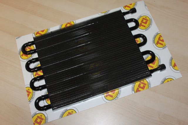 Totaling out our Christmas-In-April, we scored one of TCI’s Performance Transmission Cooler kits. Designed with racing in mind while providing the benefits of superior transmission cooling for street use as well, each of TCI’s coolers are constructed from aluminum and powder coated black with #6 AN fittings to work with either steel braided or high pressure lines.