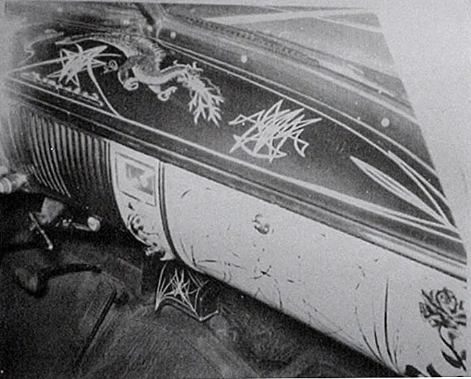 After getting absolutely no information from Jefferies, Larry ran down to the local art store to grab some brushes and copper paint. Even without the proper striping brushes or paint Watson still went to town on striping the Grapevine, his iconic 1950 Chevrolet. Being proud of the new art on the car, Larry cruised down to the Bellflower Clock Drive-In.  Everyone was in disbelief that he could afford pin striping from Von Dutch. Onlookers were in even more disbelief when he assured them that the stripes came from his own hand. His first job was so immaculate that people assumed he paid Von Dutch to sign Larry’s name instead of his own. This caused Harvey Budoff to call Larry’s bluff.