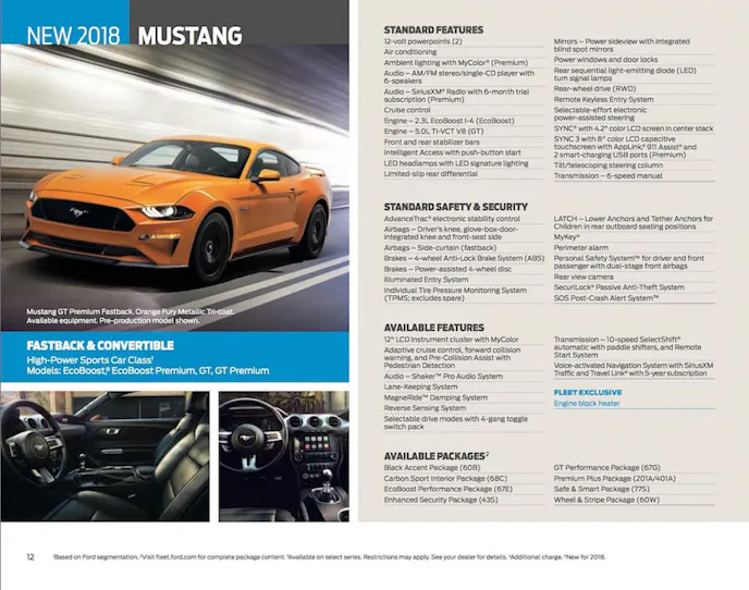 Love it or hate it, it’s still probably going to be a big seller amongst 2018 models, and the people who hate it now will get used to seeing it and move on. Okay, so I’ve droned on about the appearance for long enough, we finally know a few other things about it since someone (Ford, was that you?) leaked an official brochure. This is a fleet brochure, so individual/personal Mustangs may be differently optioned: