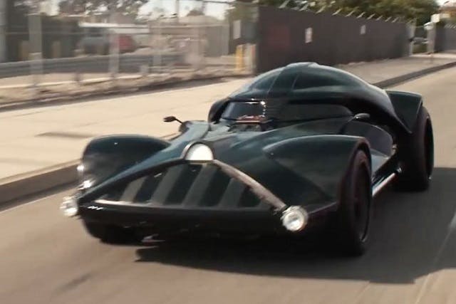 Under all the black cladding is a Chevy Corvette C6 chassis and engine, though everything from the frame on-up is pretty much a custom job. Amazingly, this is a fully functional vehicle, front to back, even though it doesn’t even look like you can get into it. We won’t spoil the surprise for you, but we will tell you to skip to around the 11-minute mark for a moment that should remind die-hard fans of a certain scene from The Empire Strikes Back.