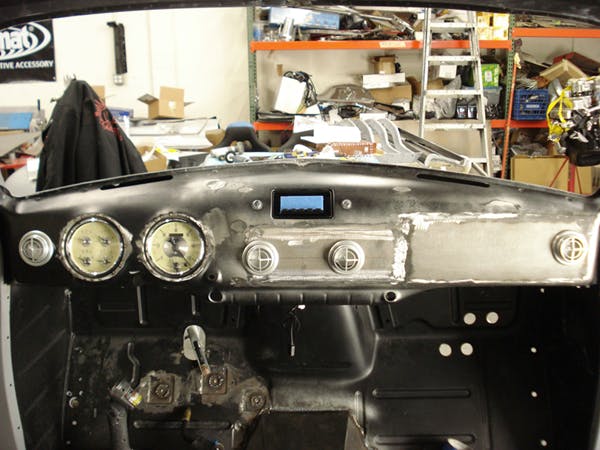Interior details include a custom-built center console to house some of the control systems as well as controls for the functional Revolver exhaust showcase. The custom bucket seats without headrests were built by Bill Dunn. The dash has been heavily customized with custom-built Auto Meter gauges set in custom bezels and openings. RetroSound handled a nice sound system – that is, if you prefer to hear them over the rumble of the exhaust.