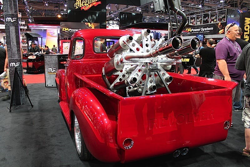 Classic and hot rodded trucks seem to be a popular theme for this year. Manaflow worked hard on their booth vehicle, and with some of the industries biggest names, the “Revolver” 1949 Chevy Pickup wowed the crowds all week long. The truck’s design influences are the brainchild of none other than longtime Magnaflow advocate and world renown designer Chip Foose. Named “Revolver” due to the display that was built to piggyback in the bed of the truck to showcase the company’s product, this ’49 Chevy is a unique truck with many custom touches.