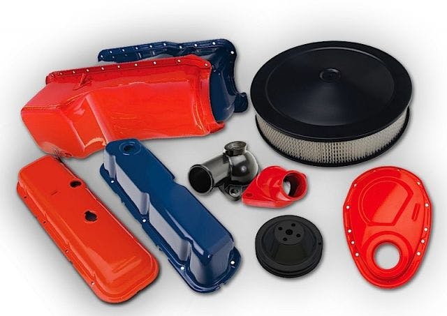 PerfectMatch oil pans, water necks, engine pulleys, radiator support panels & bars, timing chain covers, valve covers, valve caps & breathers, alternator brackets, and air cleaners are available for a variety of GM and Ford applications. Available in Ford Blue and Chevy Orange, their colors match the original production factory pieces of these vehicles, with some of the GM applications available in Asphalt Black as well.