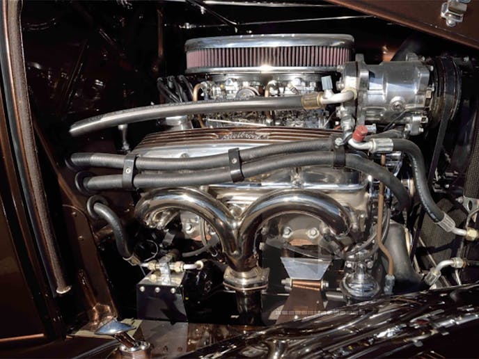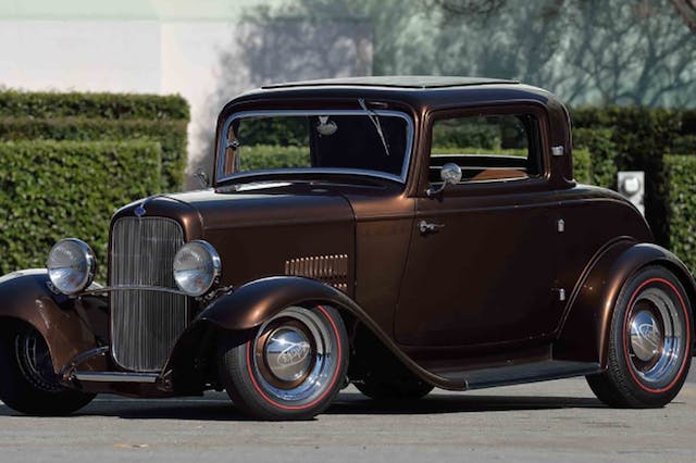 According to the preview listing, this ’32 Ford was undergoing its transformation when Mr. Lobeck passed in 2011 and the project was completed by Richard Wood Kustoms. As evidenced by the stance and styling, it follow Lobeck’s vision for the project. The Impala Brown Metallic paint, although a modern BMW color, is a perfect choice for this style and era that it conveys. Contributing to Lobeck style are hood and deck louvers in the body modification department.
