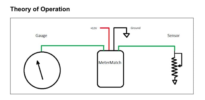 The MeterMatch module is wired between your sender unit and the fuel gauge. It reads the resistance of the sender, then based on the calibration values, works as an electronic resistor to drive your gauge to the desired reading. It treats the input and output entirely separately, so it doesn’t care if the input to the gauge is scaled differently than the sender, or even if the sender signal is reversed – it can correct for that.