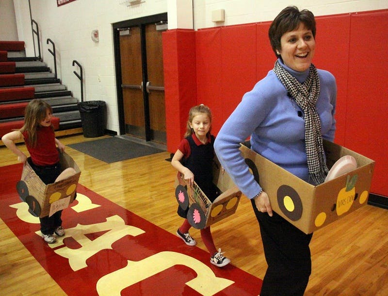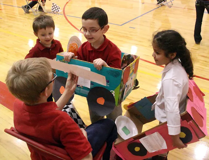 As part of the project, kindergarteners created their own hot rods out of cardboard boxes. In doing so, they learned vocabulary like taillights, license plate, and headlights. They also learned basic traffic safety rules. Then on January 25th, students took to the road (the lines in the school gymnasium) to put their reading skills to work.